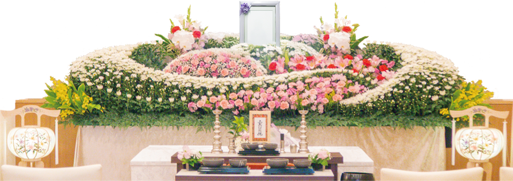 ファミーユの祭壇は華やかさと温かみを大切にした祭壇です。ご家族の気持ちに寄り添い、心和むお別れの時間を演出します。
